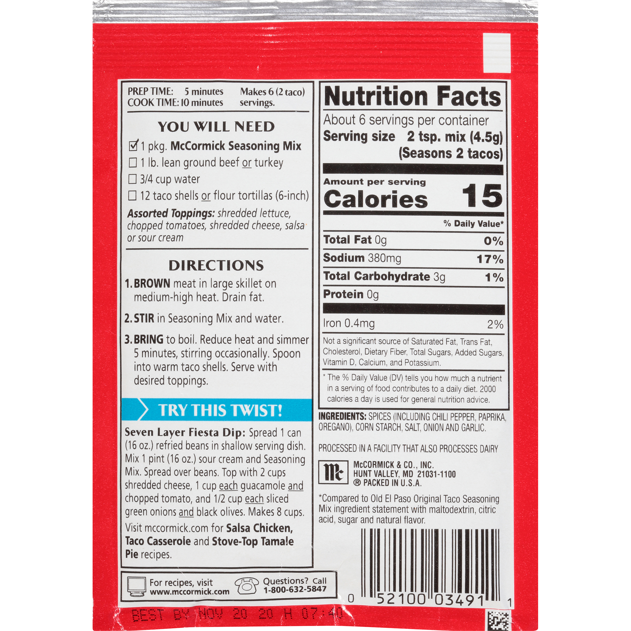 McCormick® 30% Less Sodium Taco Seasoning Mix 1 pkg. McCormick Seasoning Mix 1 lb. lean ground beef or turkey 3/4 cup water 12 taco shells or flour tortillas (6-inch) Assorted Toppings: Shredded Lettuce, Chopped Tomatoes, Shredded Cheese, Salsa or Sour Cream DIRECTIONS 1. BROWN meat in large skillet on medium-high heat. Drain fat. 2. STIR in Seasoning Mix and water. 3. BRING to boil. › p › mccormick-original-tacoMccormick Original Taco Seasoning Mix -1oz : Target Made with McCormick herbs and spices, you can use our Taco Seasoning blend knowing that you are you're giving your family the very best. If the item details above aren't accurate or complete, we want to know about it. Report incorrect product info. Show more Serving Size: 4.5 g Serving Per Container: about 6 Amount Amount per serving: Calories: 15