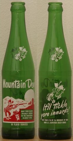 oldest mountain dew - Antique Bottles, Glass, Jars Online Community According to a website on the history of mountain dew, the first bottle is an applied color label with green glass and white paint (with no red on it). It was first used in 1955. It featured a hillbilly shooting at a 'revenuer' running from an outhouse. The two names on it were Barney & Alley. Jan 19, 2009, #3, G, grime5, Well-Known Member, Joined,