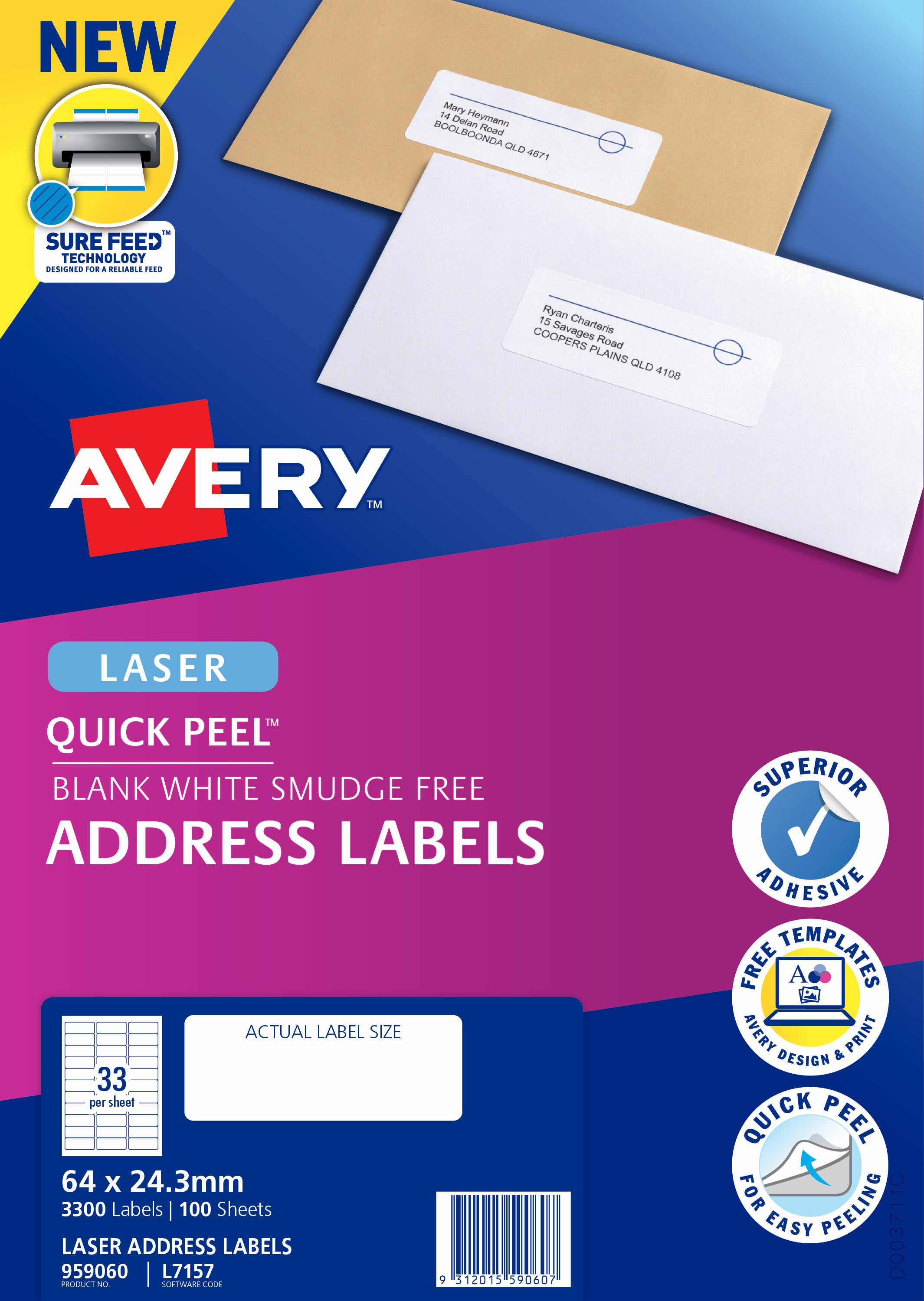 Word Template for Avery L7157 Word Template for Avery L7157 Address Labels, 64 x 24.3 mm, 33 per sheet. Supported Products. Address Labels with Smooth Feed – 959360 ...