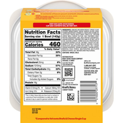 Calories in Kraft Velveeta Shells & Cheese Original and Nutrition Facts Velveeta Shells & Cheese Original Nutrition Facts Serving Size 1 cup (112 g) Amount Per Serving Calories 370 % Daily Values* Total Fat 12.00g 15% Saturated Fat 3.000g 15% Trans Fat 0.000g Cholesterol 15mg 5% Sodium 860mg 37% Total Carbohydrate 49.00g 18% Dietary Fiber 1.0g 4% Sugars 4.00g Includes 0.00g Added Sugars 0% Protein 13.00g Vitamin D 0mcg