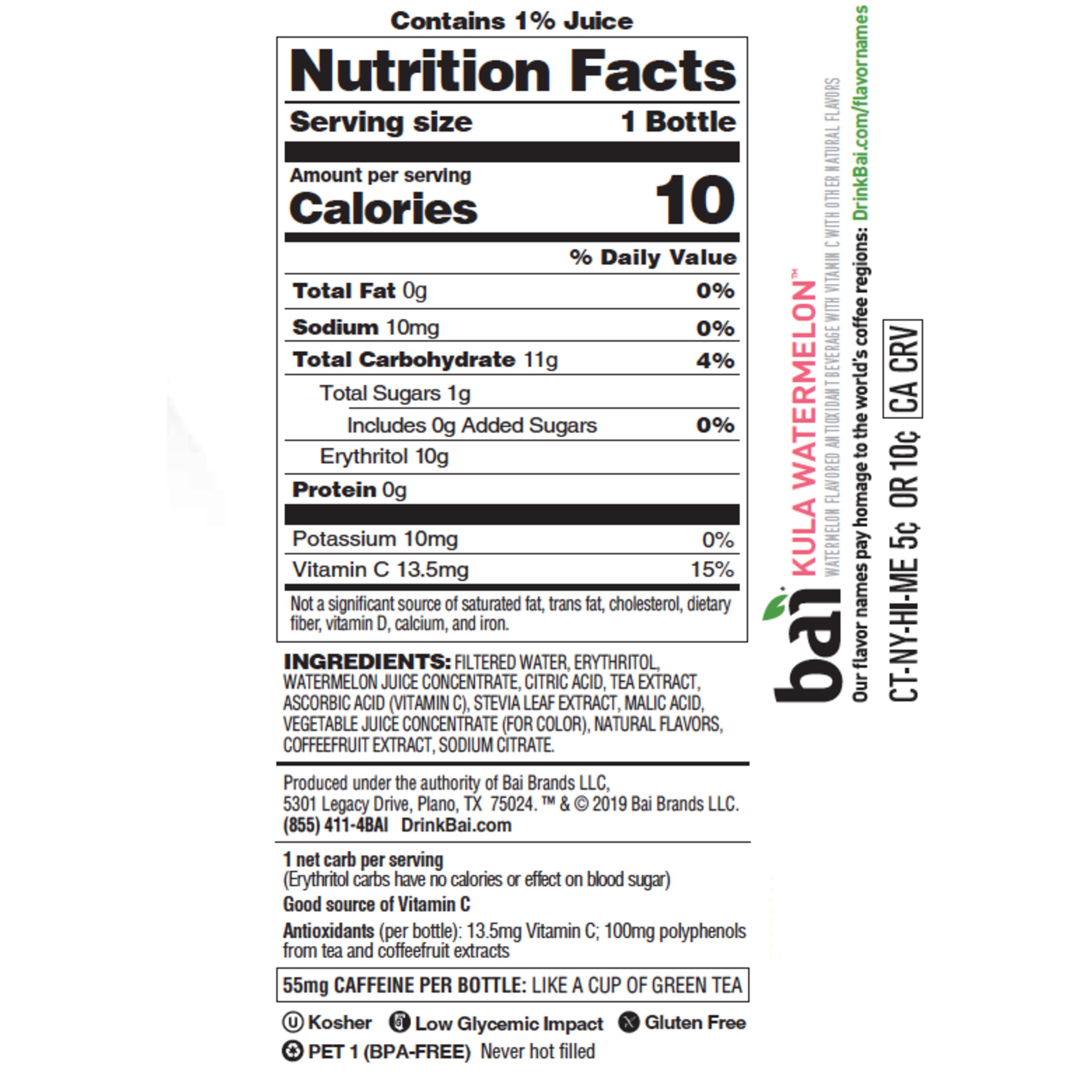 What Ingredients Are Inside - Bai Antioxidant Infusion Drinks Bai Proprietary Sweetener Blend contains two ingredients: erythritol and stevia leaf extract. Stevia leaf extract is the common or usual ingredient name for the ... Bai Antioxidant Infusion Kula Watermelon Beverage - H-E-B Nutrition Facts · Amount Per Serving. Calories. 10 · % Daily Value · Total Fat. 0g; 0% · Sodium. 10mg; 0% · Total Carbohydrate. 11g; 4% · Total Sugars. 1g · Includes ... Bai Antioxidant Infusion Antioxidant Beverage, Panama Peach - EWG FILTERED WATER, ERYTHRITOL, PEACH JUICE CONCENTRATE, CITRIC ACID, FRUIT AND VEGETABLE JUICE CONCENTRATE (FOR COLOR), TEA EXTRACT, ASCORBIC ACID (VITAMIN C), ...