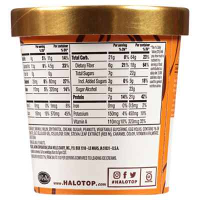 Peanut Butter Cup Ice Cream | HALO TOP® This pint of peanut butter and chocolate deliciousness is a homerun to any Peanut Butter Cup lover. Boasting only 330 calories and packed with a good source ... Carbs in Halo Top Peanut Butter Cup Ice Cream Halo Top Peanut Butter Cup Ice Cream (0.5 cup) contains 15g total carbs, 7g net carbs, 3.5g fat, 5g protein, and 80 calories. Halo Top Light Ice Cream Peanut Butter Cup - Giant Food 320 Calories per pint. Good source of protein. 1 Pint (473 ml). Let's not rush this™. It's worth the wait.™ You might notice that your Halo ...